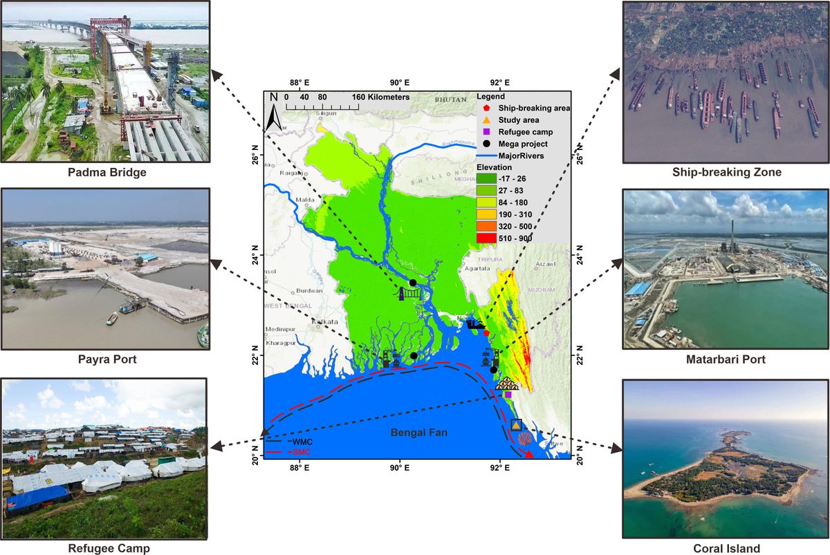 The rapid expansion of mega-projects and industries along Bangladesh's coast, coupled with the unprecedented humanitarian crisis of the Rohingya refugee camps, is imposing severe and lasting pollution on the Bay of Bengal's fragile ecosystem. The massive infrastructure projects, including the Padma Bridge and new deep-sea ports like Matarbari and Payra, generate significant construction runoff, sediment disruption, and increased marine traffic, leading to water turbidity and habitat destruction. Most critically, the ship-breaking yards of Sitakunda discharge a toxic cocktail of heavy metals—lead, mercury, and cadmium—asbestos, and oil directly into coastal waters, poisoning marine life and entering the food chain. Meanwhile, the densely populated refugee camps in Cox's Bazar, lacking adequate waste management, produce thousands of tons of untreated sewage and solid waste daily, which flows into waterways and eventually the bay, causing nutrient pollution and disease outbreaks. This multi-source assault threatens the biodiversity of areas like Saint Martin's Coral Island, endangers fisheries that millions depend on for food and livelihood, and poses grave long-term risks to public health and regional ecological balance.